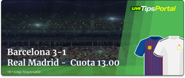Antes de finalizar con este pronóstico te queremos dejar un posible resultado para el Barcelona vs Madrid, y es que sabiendo que este tipo de partidos puede salir para cualquier lado, pero donde consideramos superior esta temporada al Barça y, además, jugará ante su gente, podemos decir que un resultado entre Barcelona vs Madrid podría ser de 3-1 a cuota 13,00 en Codere.